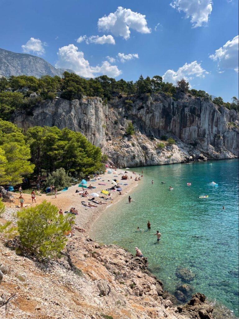 Makarska beach, also known as Donja Luka beach, stretches along the entire Makarska Riviera, offering endless opportunities for rest and recreation. This long pebble beach is famous for its clear blue sea and beautiful views of Mount Biokovo. It is equipped with numerous amenities that will make your stay pleasant and carefree, including sun loungers, parasols, sports fields and children’s playgrounds. The beach is also known for its lively atmosphere, with many cafes and bars along the coast, where you can enjoy refreshing drinks and a view of the sunset